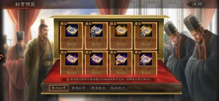 霸业装备需要兑换1000功勋。29个里有18个武将专属特技,所以运气好能直接锻造出来,那相当于拿1次霸业了。